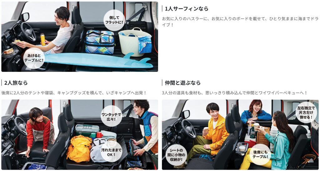 後部座席が左右独立して前後にスライドできるため、「後ろに人が乗る時は足元を広く」「荷物が多い時は荷室を広く」と柔軟に変えられます。また、助手席の座面をパカッと開けると現れる「シートアンダーボックス」など、スズキならではの気の利いた収納がたくさん隠されており、車内をスッキリ保てます✨