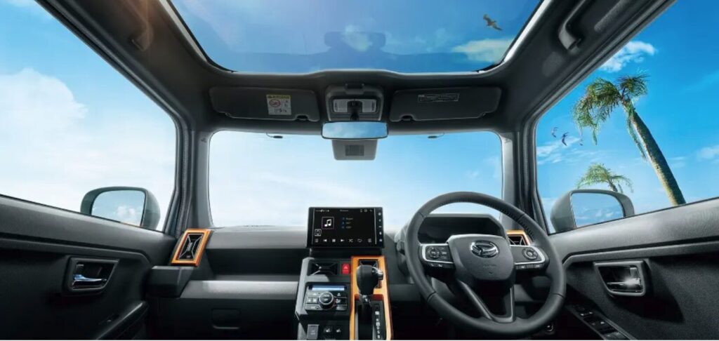 タフトの代名詞とも言えるのが、前席の頭上に広がる大きなガラス屋根です。なんと全グレードで標準装備されているんです❗️紫外線や赤外線をカットするガラスなので日焼けの心配も少なく、ドライブ中の景色や開放感は他の軽自動車では絶対に味わえません。夜には星空を見上げることもできますので、キャンプや山間部へのお出かけの際には都会では見られないような満点の星空が楽しめます✨